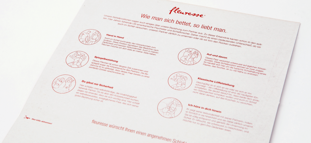 Durch diverse „Convenience“-Funktionen wie zum Beispiel Einschlaftipps, Wasch- und Pflegeanleitungen, Bespannungstipps oder auch was die unterschiedlichen Schlafpositionen im Doppelbett über den Zustand der Partnerschaft verraten, erhält der Konsument auf der Verpackungsinnenseite einen interessanten Mehrwert zum Produkt geliefert.